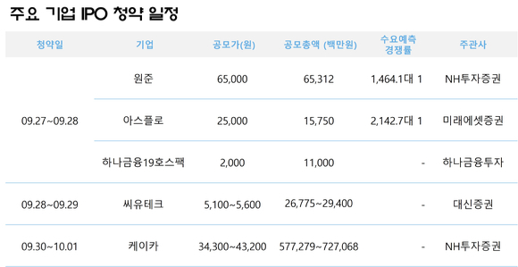 9월에 주요 공모주는 원준, 아스폴로, 씨유테크, 케이카 등인데요.