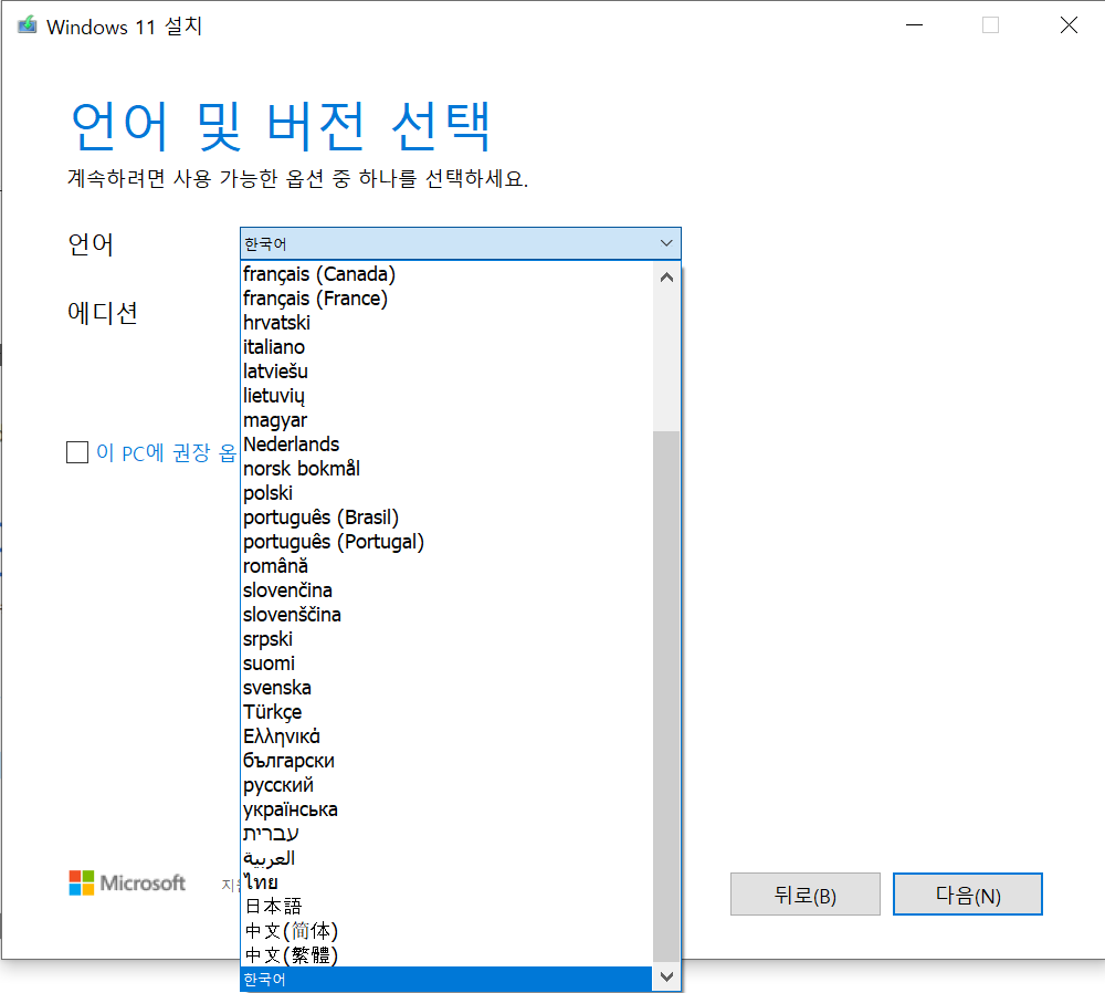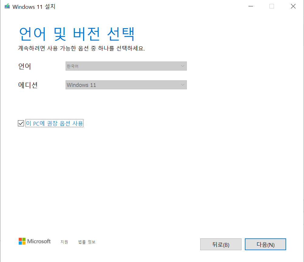 현재 PC에 맞는 윈도우 11 기본 버전으로 체크되어 있고
