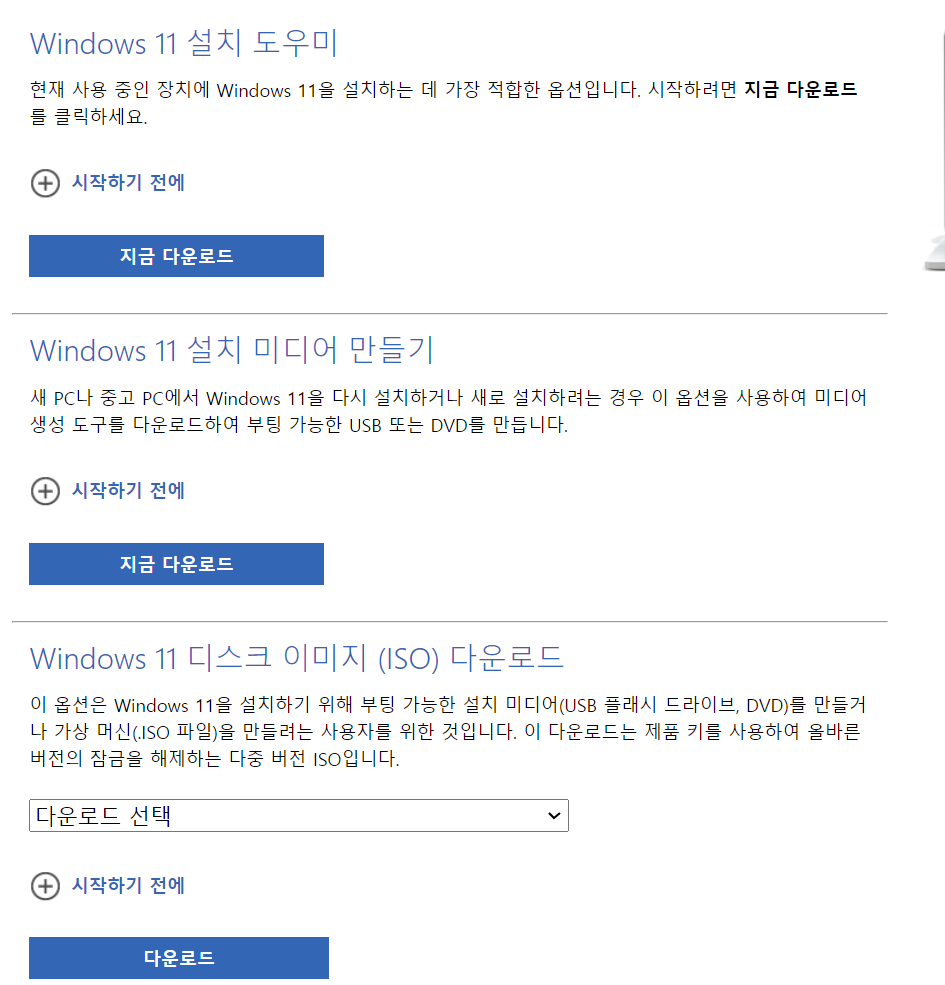 위 사이트에 접속하시면 3가지 방법으로 윈도우 11 설치가 가능한데요.
