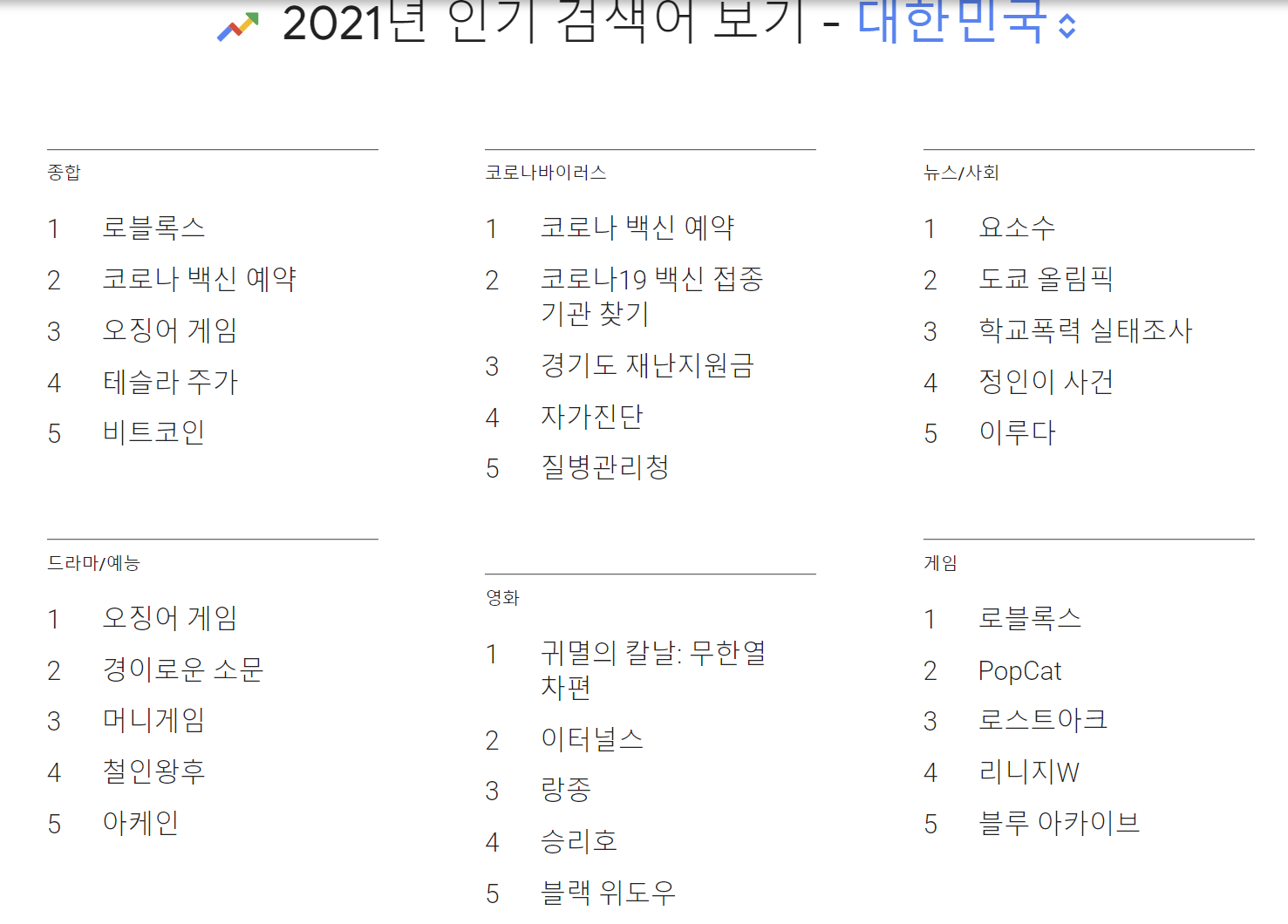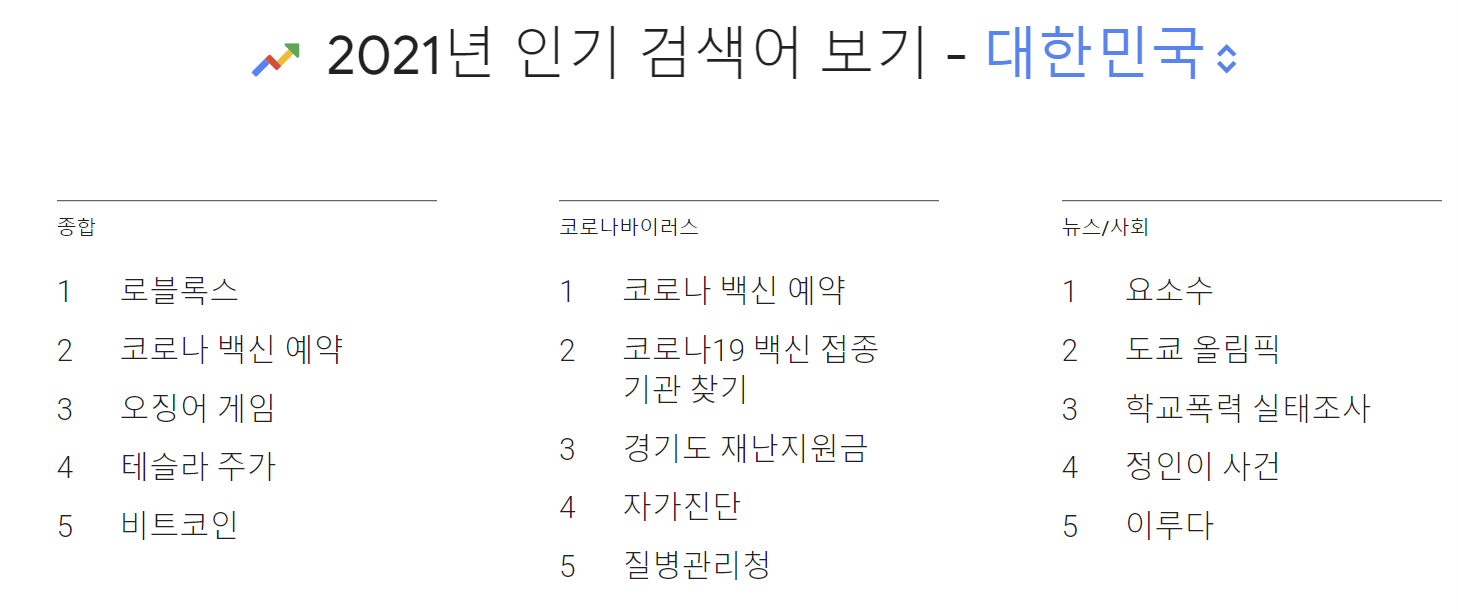구글에서 2021년 올해의 인기 검색어를 공개하였습니다.