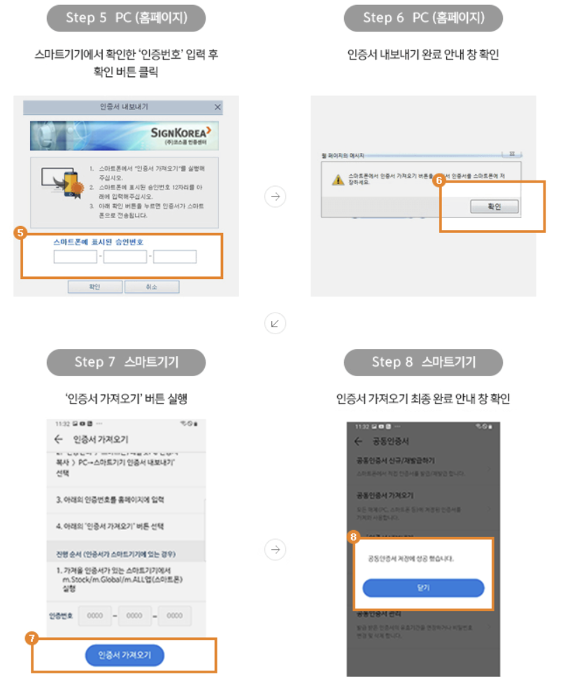이후 인증 번호를 기록하시고, 홈페이지에서 PC -> 스마트기기/PC 인증서 내보내기 메뉴에서