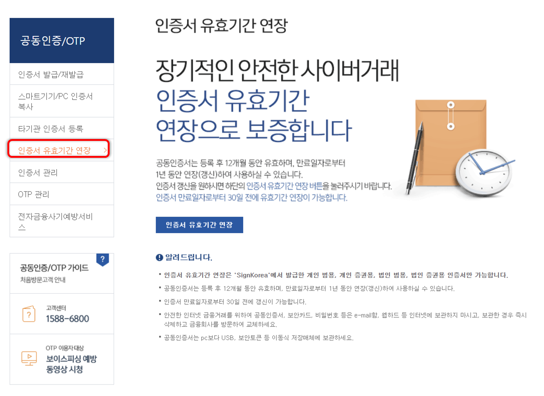 이 후 인증서 유효기간 연장 메뉴를 통해서 연장이 가능합니다.