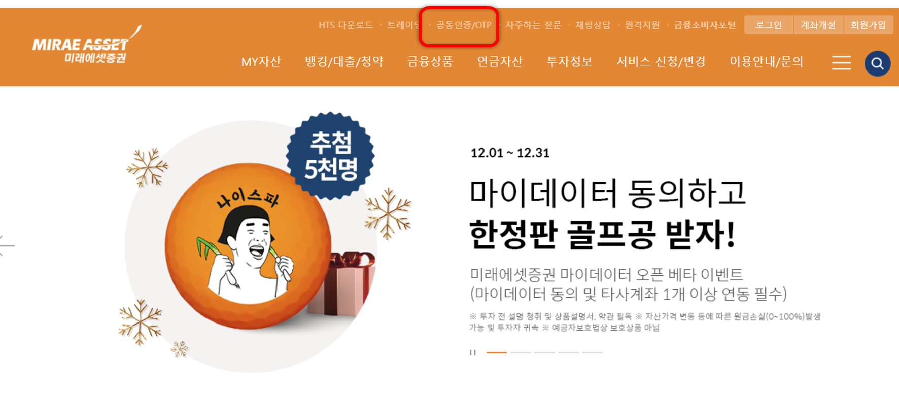 미래에셋증권 메인 홈페이지에서 -> 공동인증/OTP 메뉴로 진입합니다.