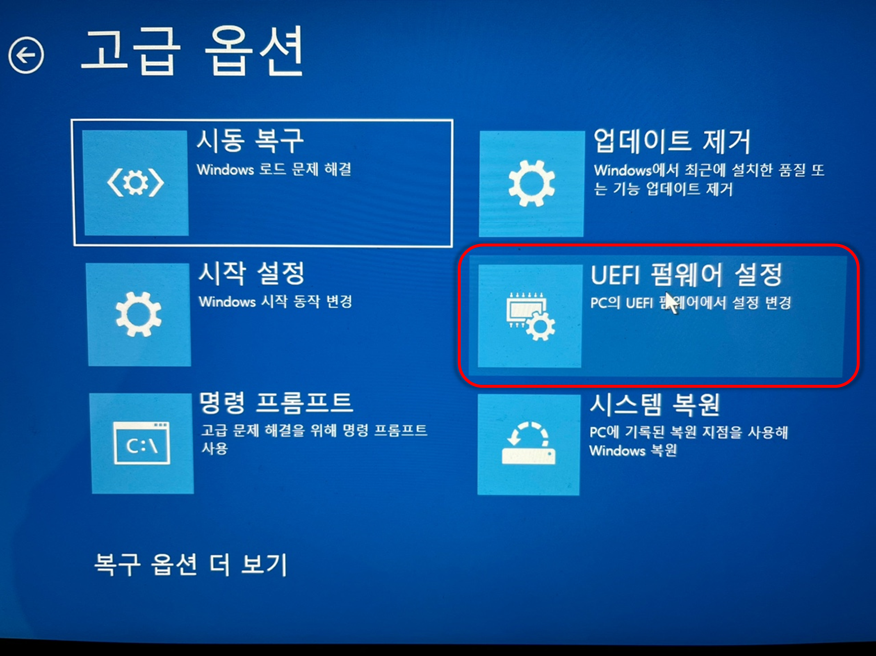 바이오스를 진입해야 하기 때문에 고급 옵션 메뉴중