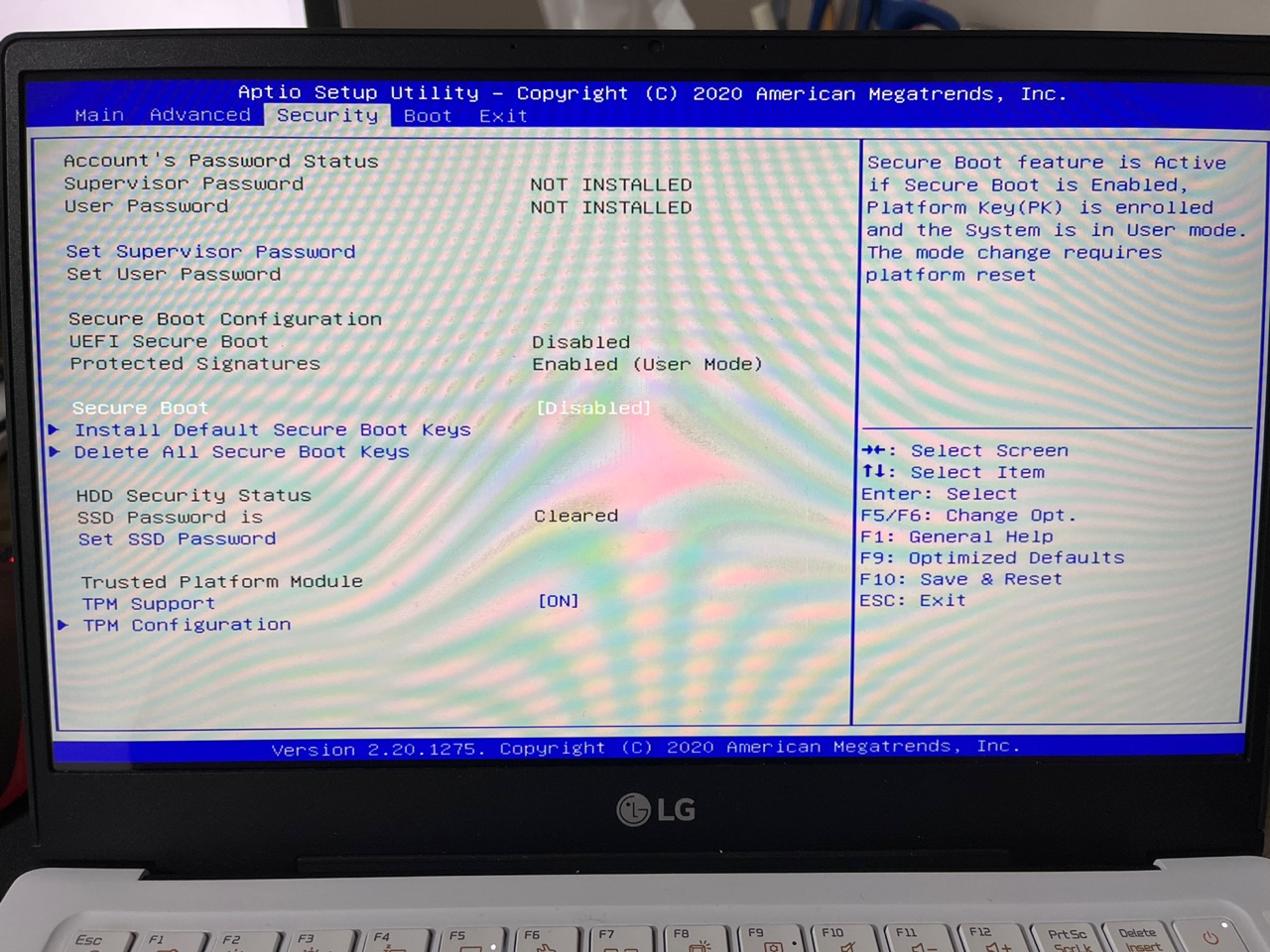 이 때 Security -> Secure boot를 Disabled로 변경하시어 사용하시면 됩니다.