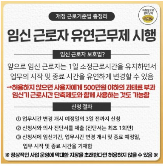 임신 근무자는 1일 소정 근로시간을 유지하면서 시작과 종료시간을 유연하게 변경 가능