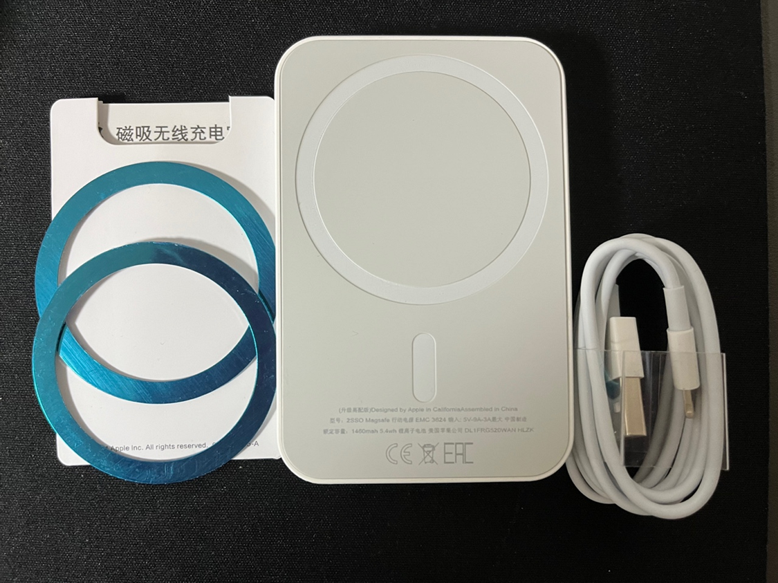 맥세이프용 스티커 2개와 본체, 설명서, 그리고 케이블이 동봉되어 있습니다.