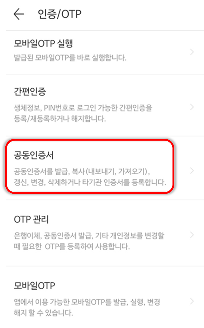 그리고 인증/OTP메뉴에서 공동인증서로 진입합니다.
