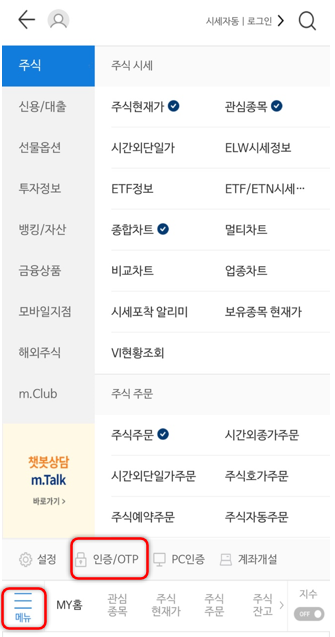 그리고 하단에 위치한 메뉴 - 인증/OTP 메뉴로 진입합니다.