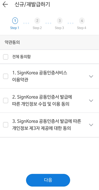 이후 재발급을 위한 약관에 동의해야하는데요.
