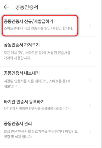 이후 상단에 위치한 공동인증서 신규/재발급하기 메뉴로 진입합니다.