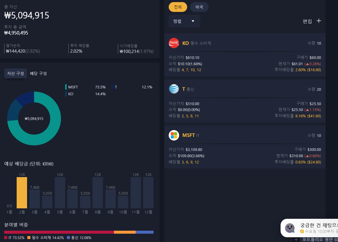 배당금 정보는 메인화면에서 - 포트폴리오 메뉴로 들어간다음