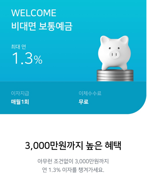 비대면보통예금은 조건없이 3천만원까지 1.3%이자를 제공하고 있습니다.