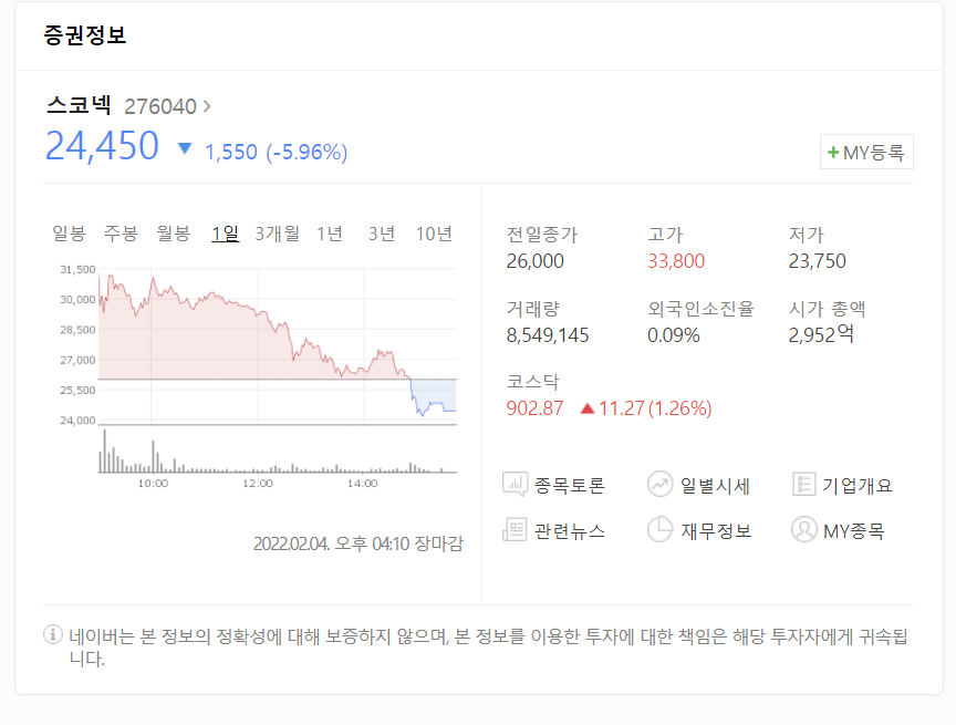 장초반에는 33,800원까지 올라갔다가 끝날대는 폭락하여 24,450원으로 마감하였습니다.