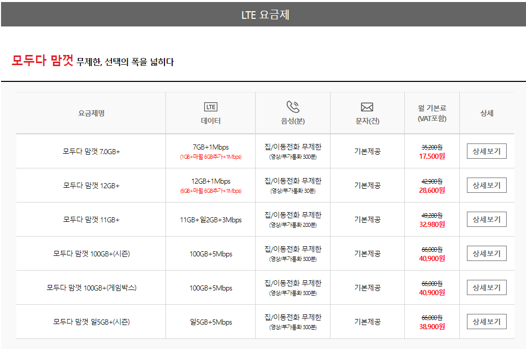 1만원대의 무제한은 모두다 맘껏 7GB+입니다.