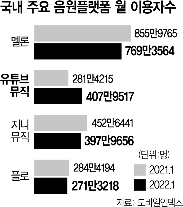 기존 멜론·지니뮤직·플로 ‘3강 체제’에서 플로(271만)와 지니뮤직(398만)을 제쳤습니다.