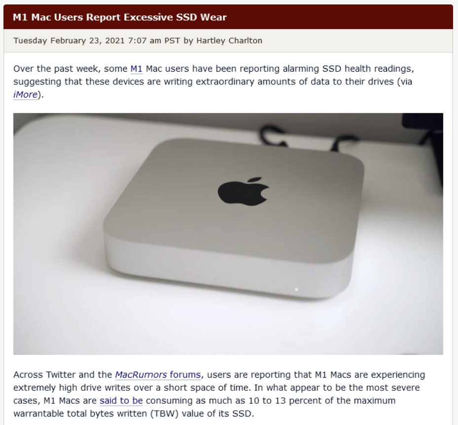 또한 이러한 메모리 누수로 인하여 m1 맥 미니에서 ssd의 수명을 과도하게 깎아먹는 문제가 있었습니다.