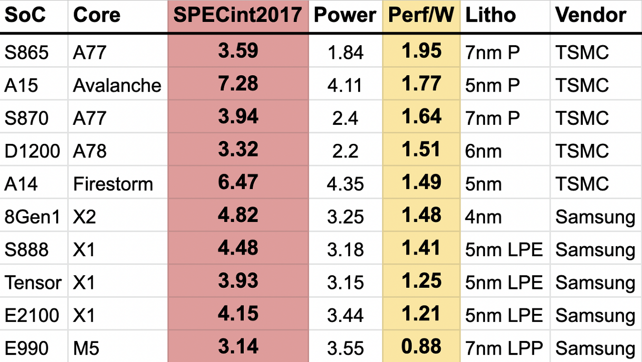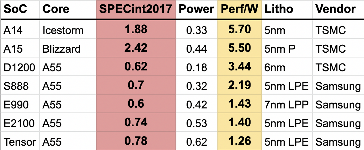전성비가 상위권에 있는 모델은 모두 TSMC 제품입니다.