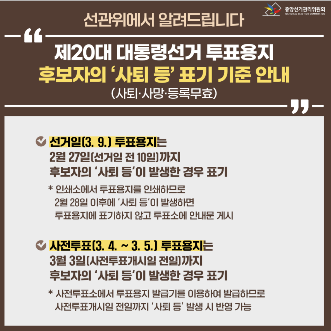 선거일 투표용지는 2월 27일(선거일 전 10일)까지 후보자의 사퇴가 발생하면 표기하구요.