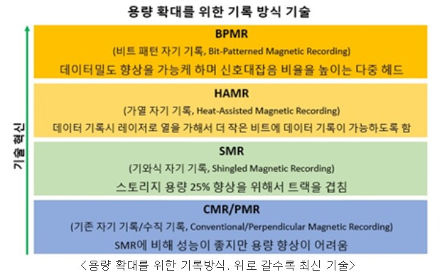 씨게이트의 경우, 수직 자기 기록 기술(PMR)에 이어 기와형 자기 기록 기술(SMR : Shingled Magnetic Recording)을