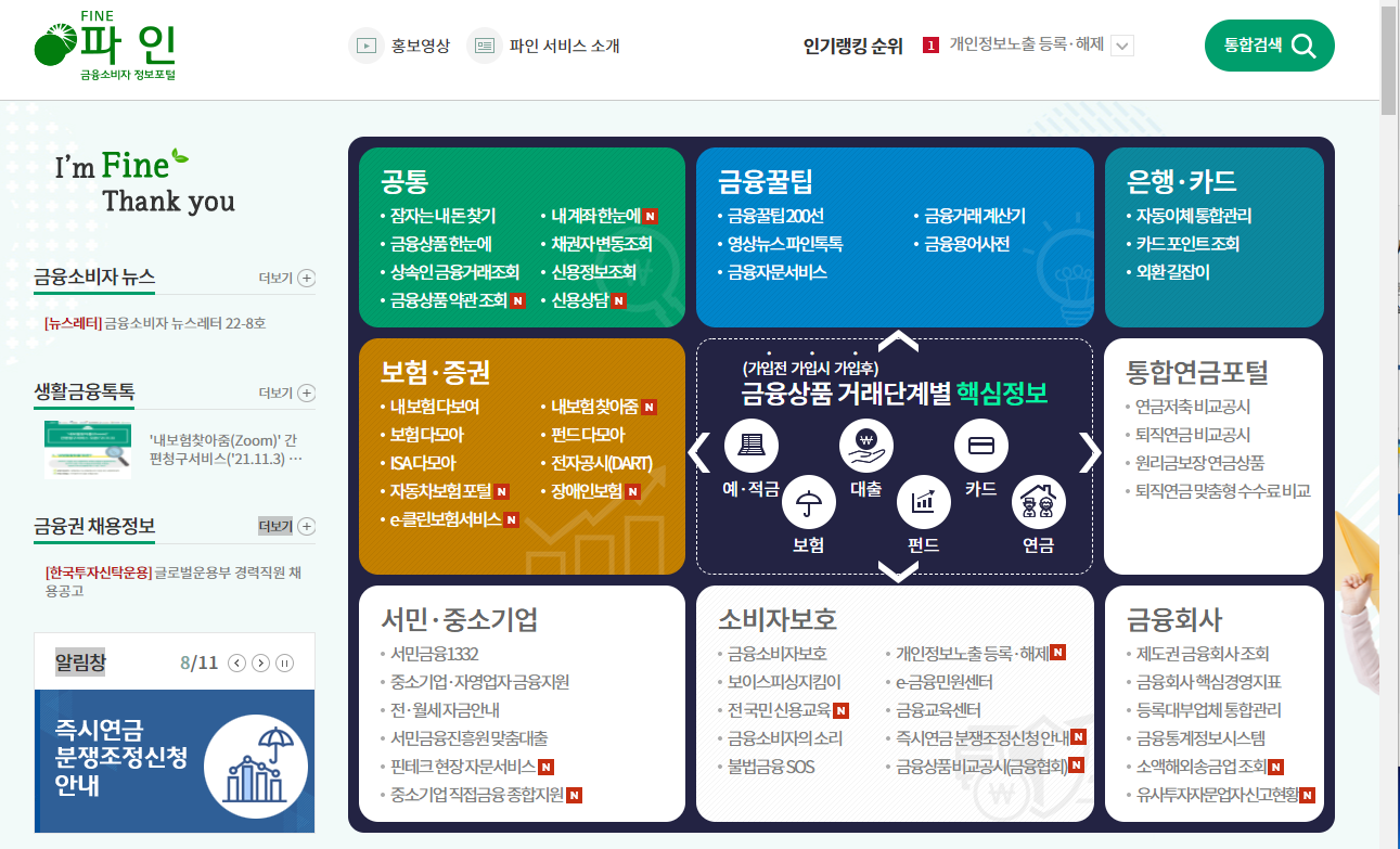 금융소비자가 금융거래과정에서 필요하거나 알아두면 유익한 금융정보를 망라하여 제공, 금융감독원 파인, 금감원 파인, 휴면계좌 통합조회, 금융상품 한눈에, 연금저축 통합공시, 보험다모아,