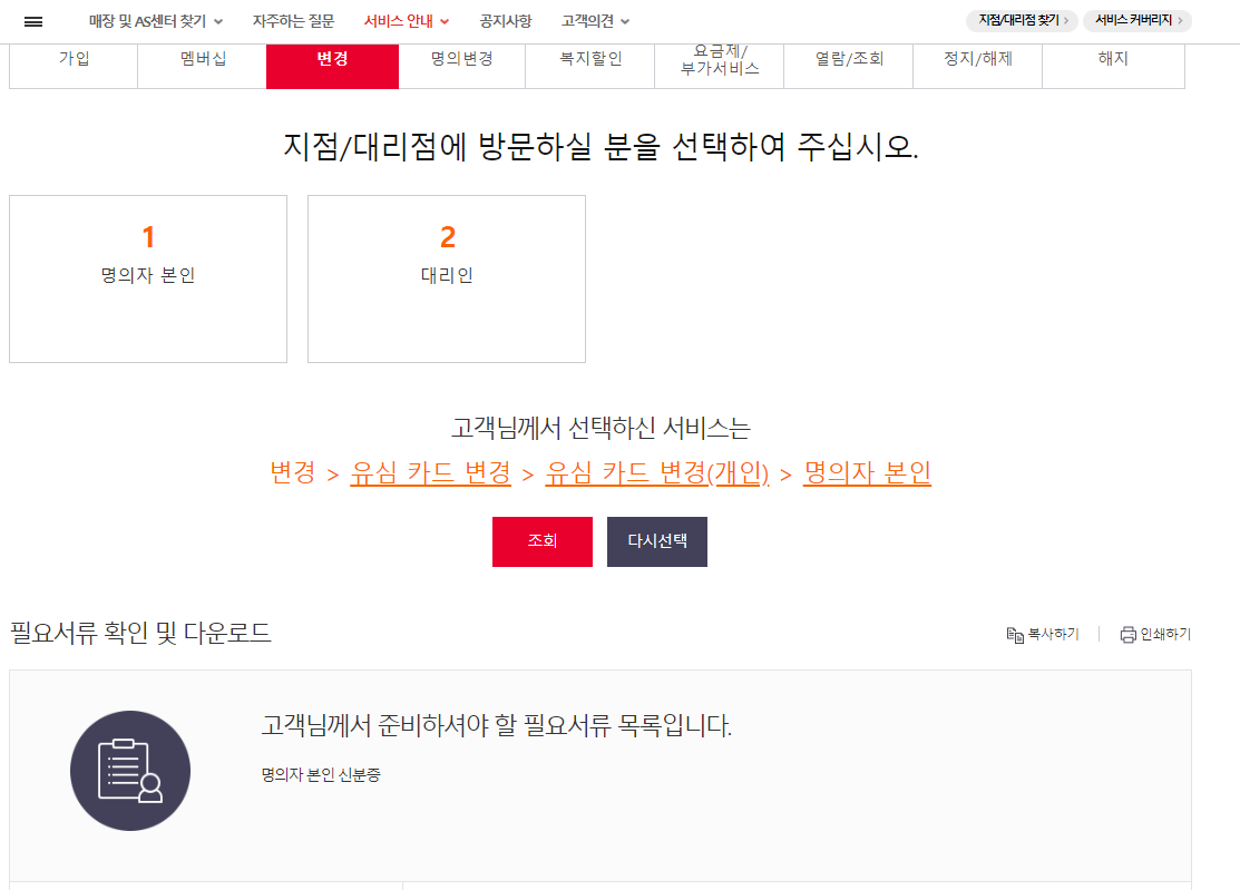 필요서류 확인 및 다운로드 --> 고객님께서 준비하셔야 할 필요서류 목록입니다. 위임장 신규가입, 명의변경 등의 업무처리를 대리인에게 위임하는 동의서 다운로드 변경 신청서 휴대폰번호, 요