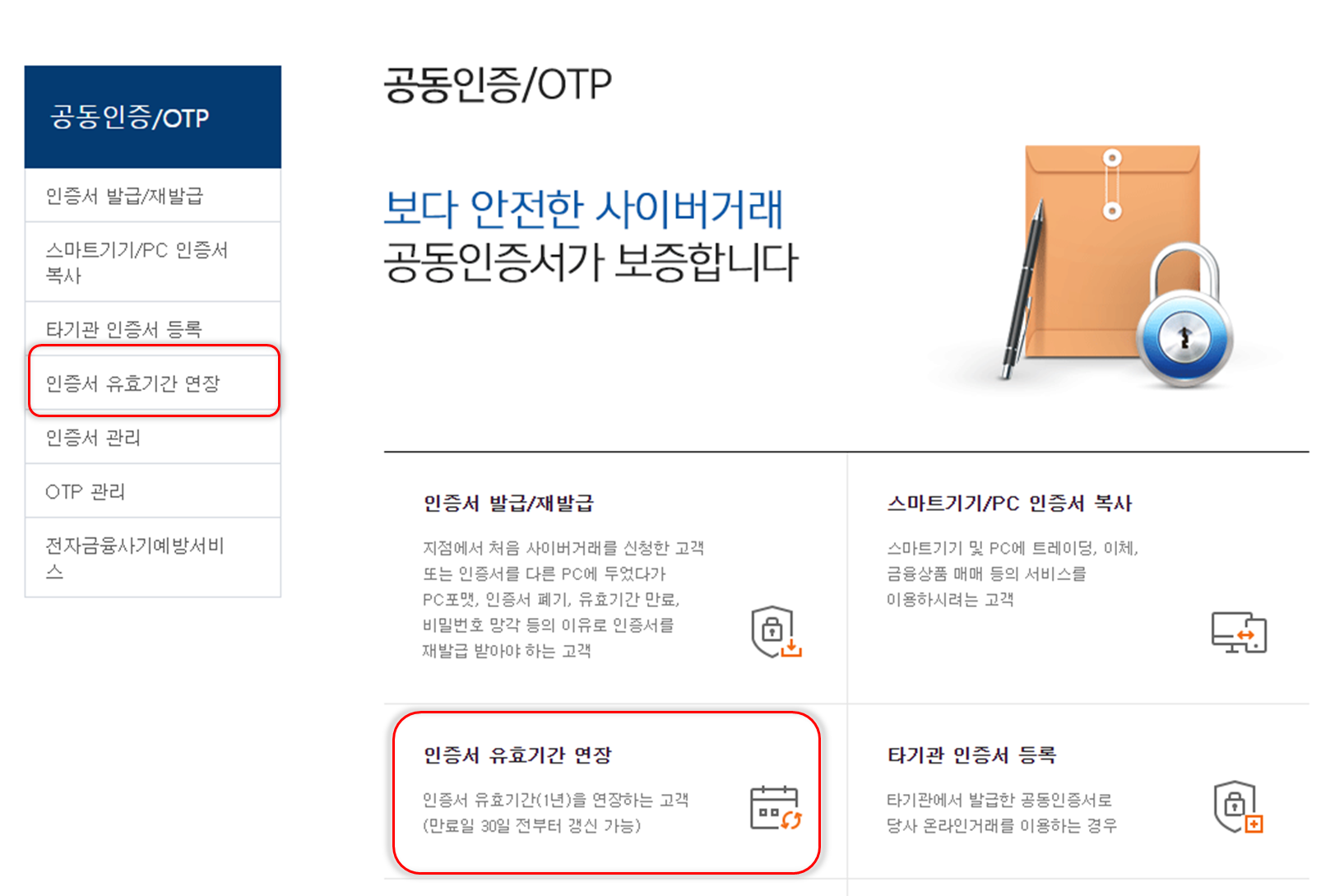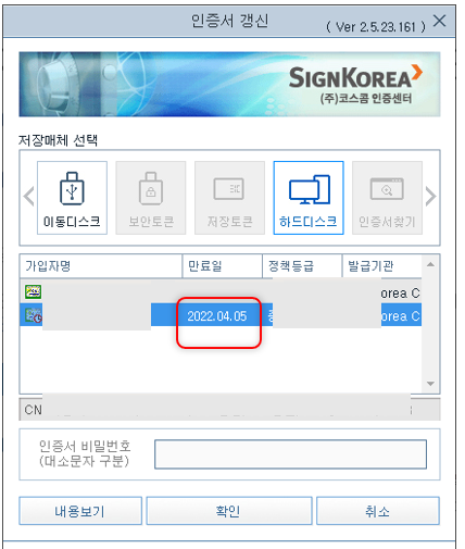 메뉴 중 인증서 유효기간 연장을 클릭합니다.
