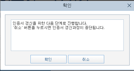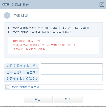비밀번호를 변경할 것이 아니라면 이전 인증서 비밀번호만 입력하고 확인을 눌러줍니다.