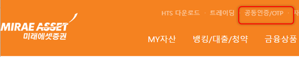 상단에 위치한 공동인증/OTP 메뉴로 진입합니다.