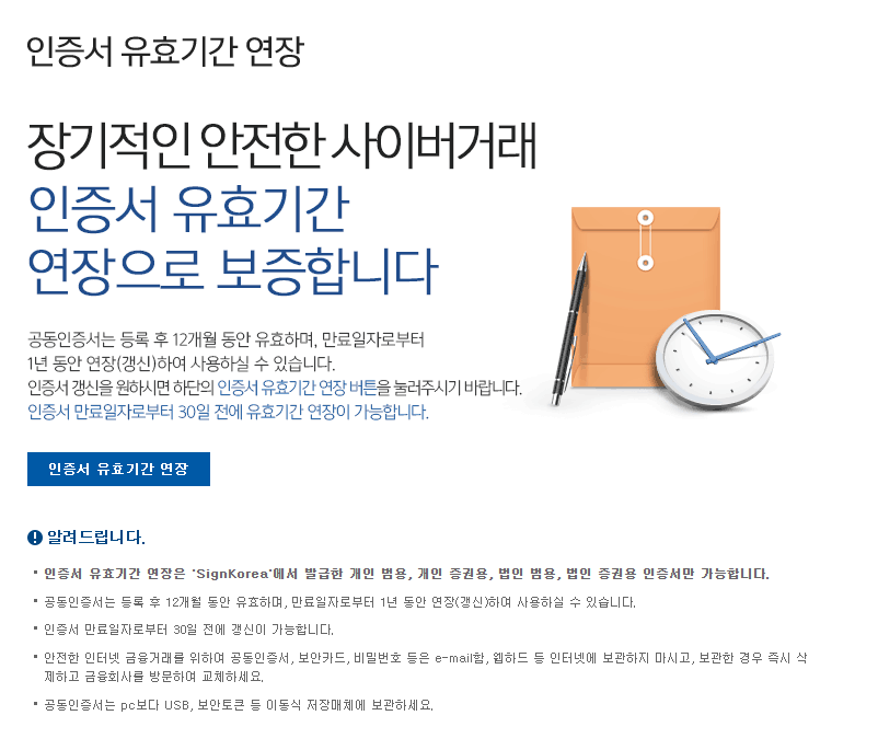 인증서 유효기간 연장 메뉴를 누르면 아래와 같이 공동인증서의 유효기간에 대한 안내가 나옵니다.
