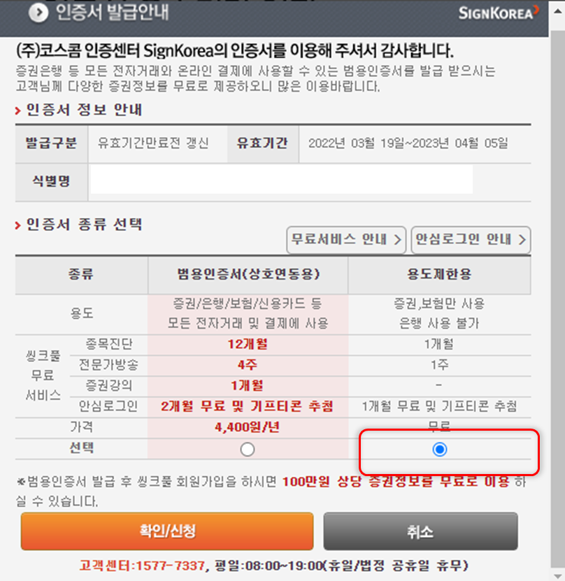 저는 무료로 갱신할 것이기 때문에, 용도 제한용으로 선택하여 발급합니다.