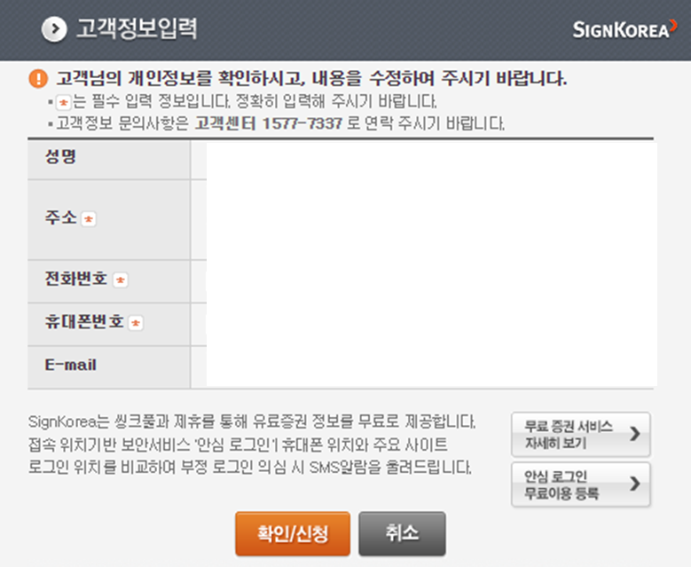 이후 성명, 주소, 연락처, 이메일 등 개인정보를 확인하신 뒤