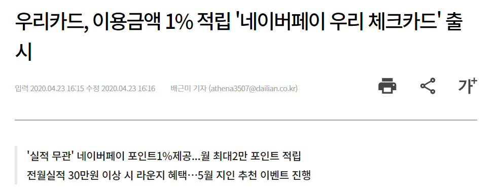 네이버페이 체크카드가 이용금액 1% 적립인데 한도가 2만포인트 뿐이기 때문에