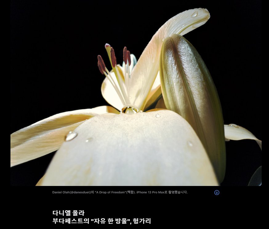 사진작가: “강렬한 그림자로 강조된 꽃잎의 감싸는 모양은 탐험할 준비가 된 깊은 동굴을 생각하게 했습니다. 꽃 내부의 관점을 유지하여 히비스커스의 자연스러운 프레임이 우리를 그 아름다움의 일부로 느끼도록 하고 싶었습니다. 매크로 모드에 대해 처음 알게 되었을 때, 새로운 iPhone 13 Pro에서 얻을 수 있는 또 하나의 멋진 새 기능이라고 생각했습니다. 그러나 그 가능성을 탐구하기 시작했을 때 나는 그것을 정말로 사랑하기 시작했습니다. 나는 그것이 내가 보는 거의 모든 것을 현실과 다른 추상적인 주제로 바꿀 수 있는 가능성을 제공한다는 것을 발견했습니다. 이 기능은 정말 제 상상력을 발휘해주었습니다.”