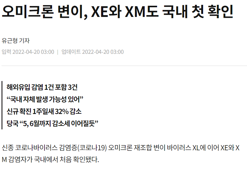 질병관리청 관계자는 “XE, XM 등 오미크론 재조합 변이는 (넓은 범위의) 오미크론으로 분류하고 있어