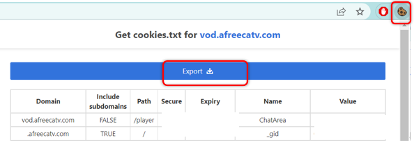 이후 아프리카 사이트에서 get cookie를 클릭하여