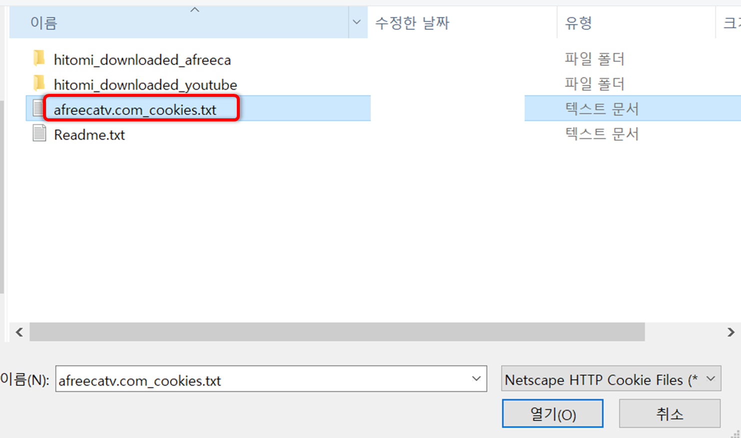 해당 파일을 기본값으로 저장하셨다면, afreecatv.com_cookies.txt라는 파일로 저장되었을 것이구요.