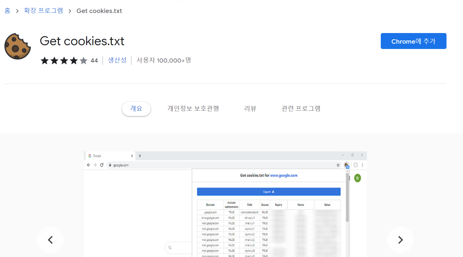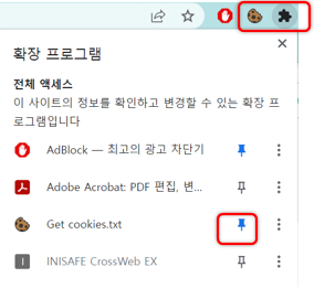 이 쿠키를 제공하기 위해서는 크롬의 확장 프로그램인 Get Cookies가 필요합니다.