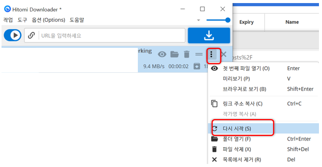 이 후 히토미 다운로더에서 다시 시작을 누르면 파일이 정상적으로 다운로드 받아지게 됩니다.