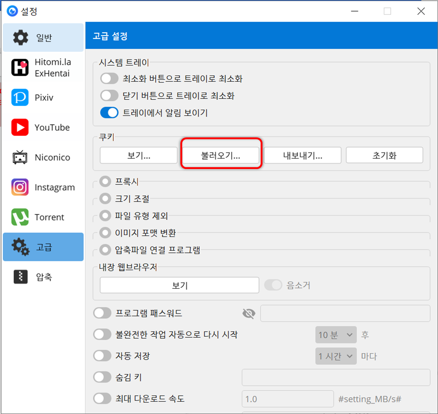 아까 히토미의 쿠키 설정 메뉴에서 불러오기를 하여 해당 저장한 텍스트 파일을 불러옵니다.