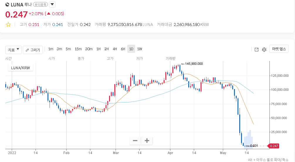 스테이블코인을 지향하던 루나코인이 상폐되었습니다.