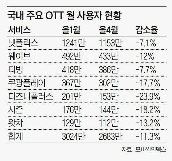 특히 웨이브가 빠른속도로 가입자가 줄고 있는데요. 이제 넷플릭스, 티빙, 쿠팡플레이에게도 밀린
