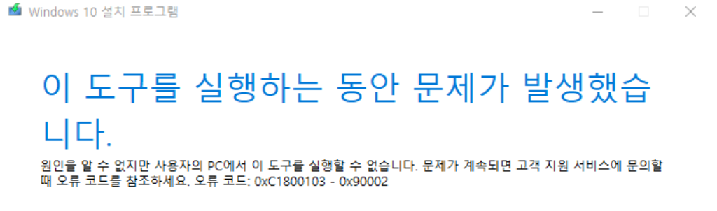 문제가 계속되면 고객 지원 서비스에 문의할 때 오류 코드를 참조하세요. 오류 코드 0xC1800103 - 0x90002
