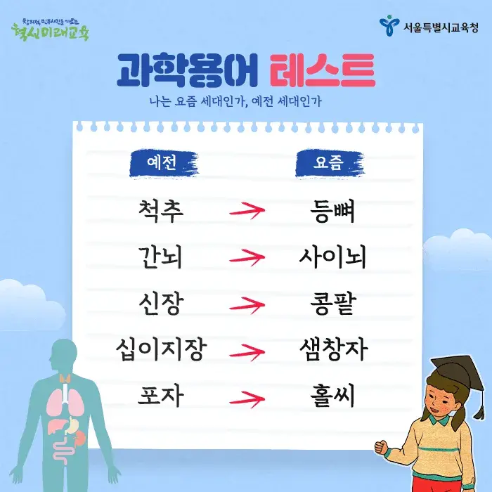 척추 대신 등뼈, 신장 대신 콩팥 등등 신기하네요.