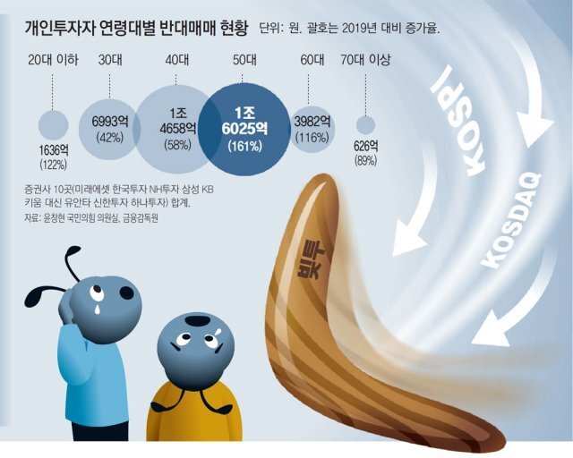 개인투자자의 연령대별 반대매매 현황을 살펴보면 50대가 1조 6025억으로 가장 큽니다.