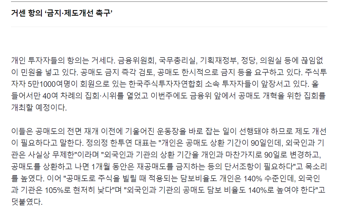 이렇기 때문에 지속적으로 작년 5월에 허용된 공매도를 다시 금지해야한다는 목소리가 나오는데요.