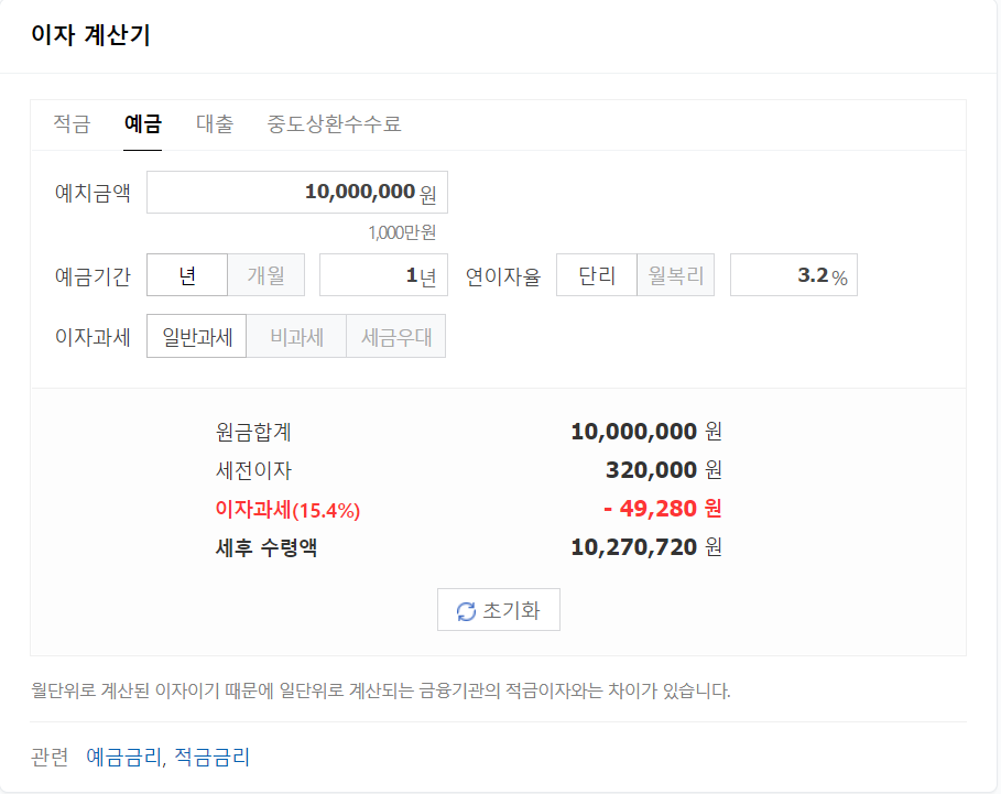 천만원으로 계산시 1년뒤 세후 수령액이 270만720원입니다.
