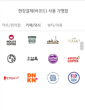 이 외에도 할리스커피, 오설록, 던킨도너츠. 베라, 파바등에서 사용가능합니다.