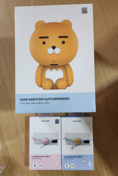 카카오프렌즈에서 판매하는 자동 손소독제 디스펜서와 게이밍 데이터 케이블을 구매해보앗습니다.