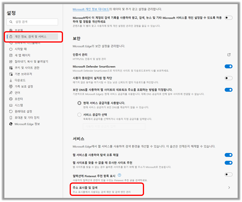 이 후 개인정보, 검색 및 서비스 메뉴에서 쭉 내려가셔서